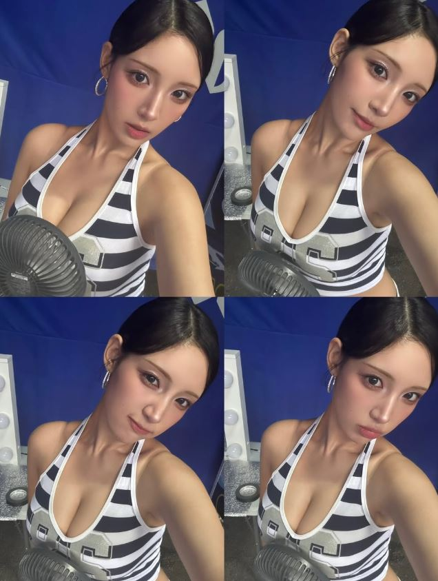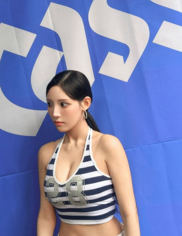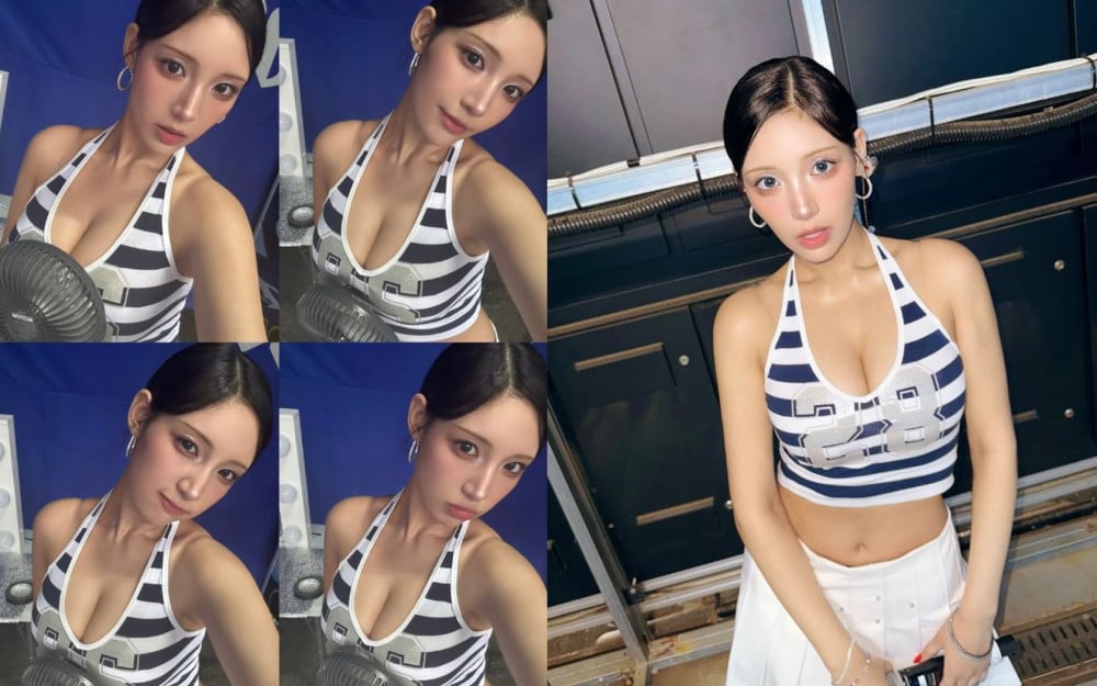 Chowon wore a blue-and-white striped crop top with a white skirt, showing off a bright, playful charm. Backstage, she posed with fun expressions and even held up a beer can for the camera, highlighting her lively personality.