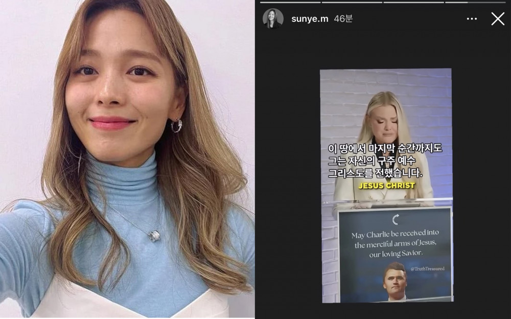 On her Instagram story, Sunye shared a screenshot of Kirk's widow Erika Kirk's speech, adding the caption, "Until his last moment on this earth, he testified to his Savior Jesus Christ," and the verses, "This is how God showed his love among us: He sent his one and only Son into the world that we might live through him. This is love: not that we loved God, but that he loved us and sent his Son as an atoning sacrifice for our sins. 1 John 4:9-10."