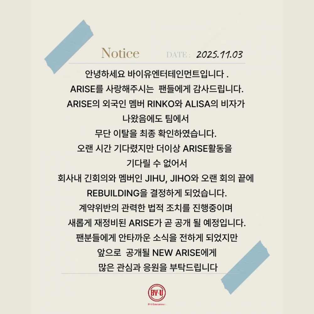 BYU Entertainment announced that girl group ARISE will undergo a restructuring after confirming the departures of members Rinko and Alisa.
