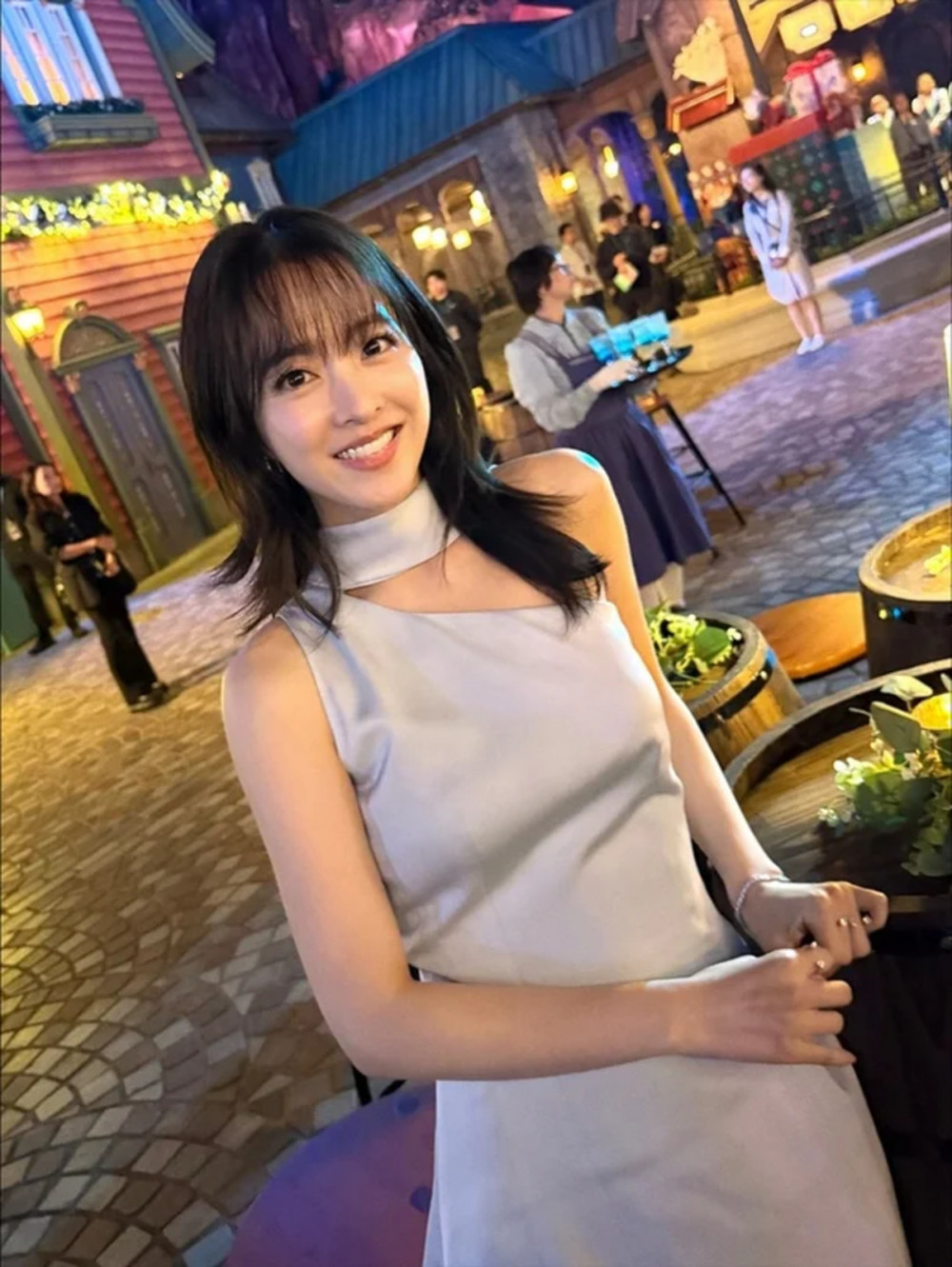 In the photos, Park Bo Young wore a baby blue mini dress that subtly blended shades of sky blue and pale gray. The dress featured a one-shoulder design paired with a halter-neck style, creating a sophisticated yet innocent look that perfectly complemented her youthful appeal. Her hairstyle drew attention as well, featuring a trendy layered cut with full bangs resting just above her eyebrows, enhancing her signature cute image. The naturally styled, slightly tousled mid-length hair harmonized with the playful elegance of her dress, highlighting her charming presence even further.