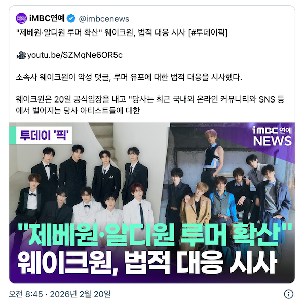Earlier on February 20 KST, in response to the ongoing controversy surrounding ALPHA DRIVE ONE member Kim Geon Woo and rumors of his "rude behavior" toward broadcasting station staff, his agency Wake One Entertainment issued a statement to warn legal action against any actions "infringe on artists' rights".