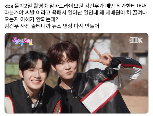 "This is all happening because ALPHA DRIVE ONE's Kim Geon Woo cursed at the main scriptwriter of KBS2's 'Idol 1N2D' saying, 'What the f*** are they saying?', so I don't understand why ZEROBASEONE is getting ragged into this? Here's a photo of Kim Geon Woo, so fix your video please."