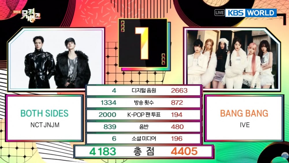 During the March 13 episode of the KBS2 music program, the No.1 nominees were IVE’s “BANG BANG” and “BOTH SIDES” by NCT unit JNJM. When the scores were tallied, JNJM’s “BOTH SIDES” received 4,183 points, placing second. Meanwhile, IVE’s “BANG BANG” earned a total of 4,405 points, securing first place. Notably, IVE claimed the win without appearing on the broadcast.