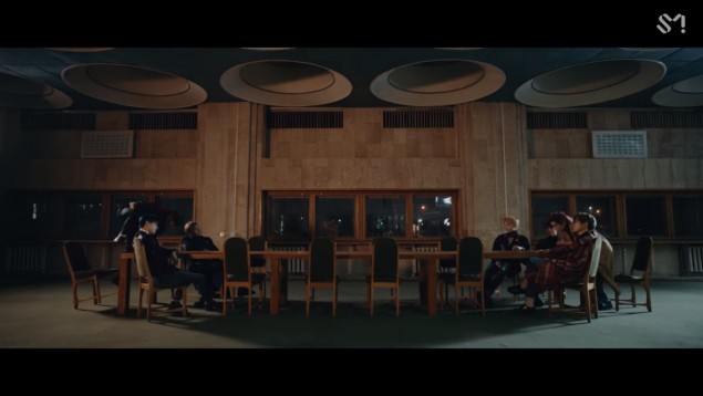 In my opinion, the architectural and historic setting of Ukraine suits this concept quite well. The modern architecture of post-WWII Eastern Europe gives this sense of ominous vacuity and industrial coolness that merge the old with the new. The great and unified but hollow-looking halls are reminiscent of the Cold War and its era of information agents and secret science experiments and interrogations. (Hence the link to NCTmentary's scientific dream labs?) The Vernadsky National Library of Ukraine (primary location of the shots) is home to one of the largest scientific and cultural collections in the world, and the interior and exterior of the building seem to have their own historical significance and aura, as they were constructed prior to the Fall of the Berlin Wall. The boys of NCT, dressed in black, look simply smart in what appear to be vintage uniforms, dashing and crisp in these settings as they dance. But, it is also important to note out that despite possible connotations, NCT do not appear to be conveying a certain form of political message. If there is one, it is the scene with Mark and Taeyong running toward each other from opposite sides for a fistfight, implying the brawl in which opposite ends of the spectrum race to become the boss. (The commentary of the MV explains that they were divided between the hyung line and the maknae line, older generation vs. newer generation.)