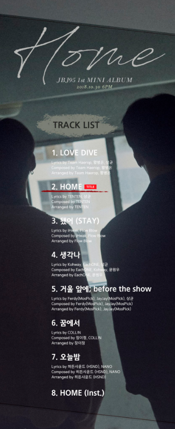 Takada Kentaand Kim Sang Gyun, or the 95ers of the project groupJBJ, have come together for a re-debut as a duo. The two idols are coming with their very 1st mini album 'Home', which contains the 8 tracks - "Love Dive", "Home" (title), "Stay", "In My Mind", "Before the Show", "In My Dream", "Tonight", and "Home (Inst.)".