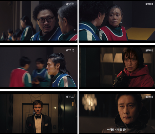 Emotional moments pepper the trailer: Geum Ja (Kang Ae Sim) begs for the game to stop in tears, while Myung Gi (Im Si Wan) scolds Jun Hee (Jo Yu Ri) with the line, "What are you planning to do? Sit here and die?" Tension peaks when Gi Hun, wearing a suit and badge number 456, confronts the unmasked Front Man, who asks him directly, "456, do you still trust people?"
