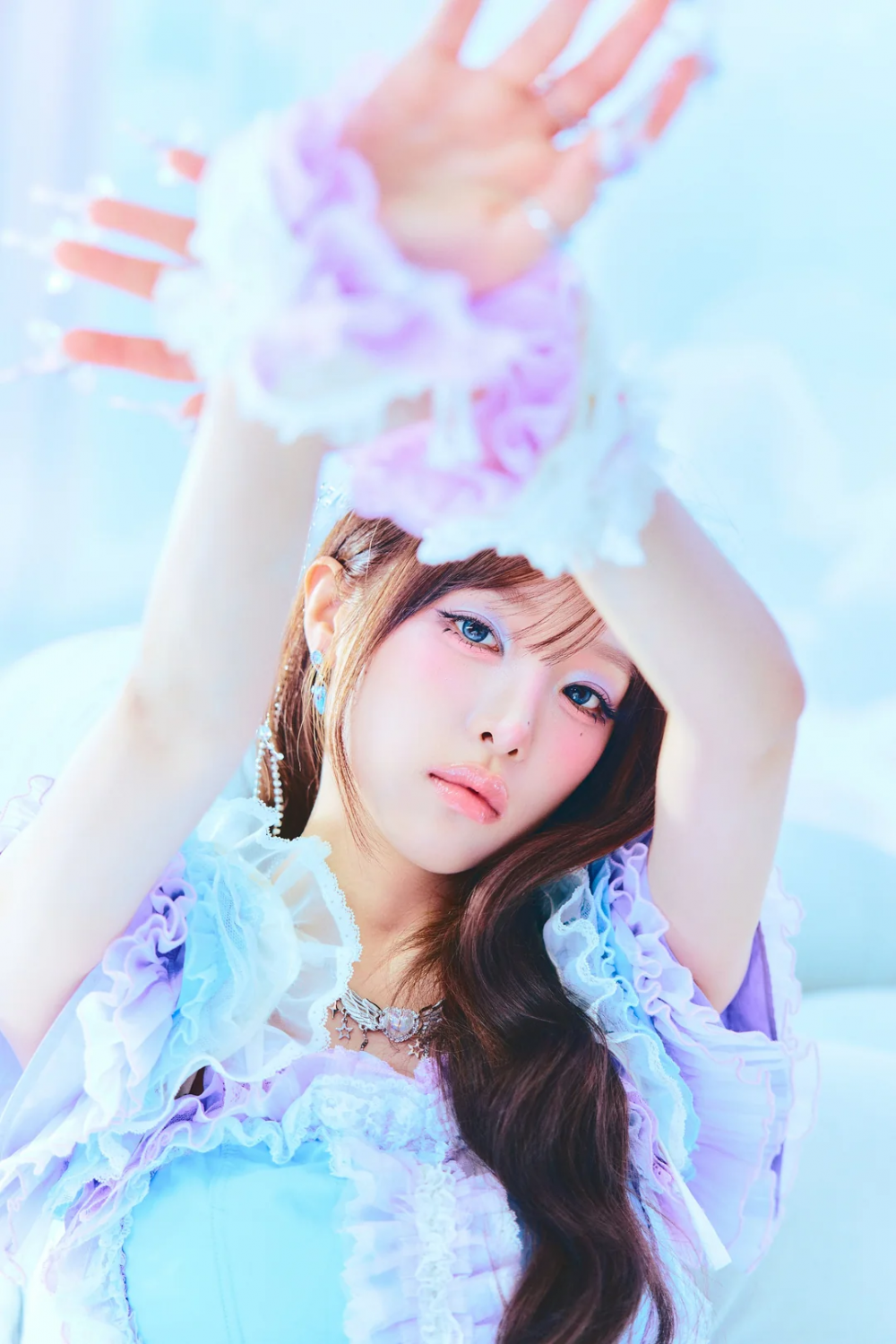 In the new concept photos released on July 9, Choi Ye Na radiates princess fairy vibes in a light purple, blue lace dress adorned with pearl accessories.