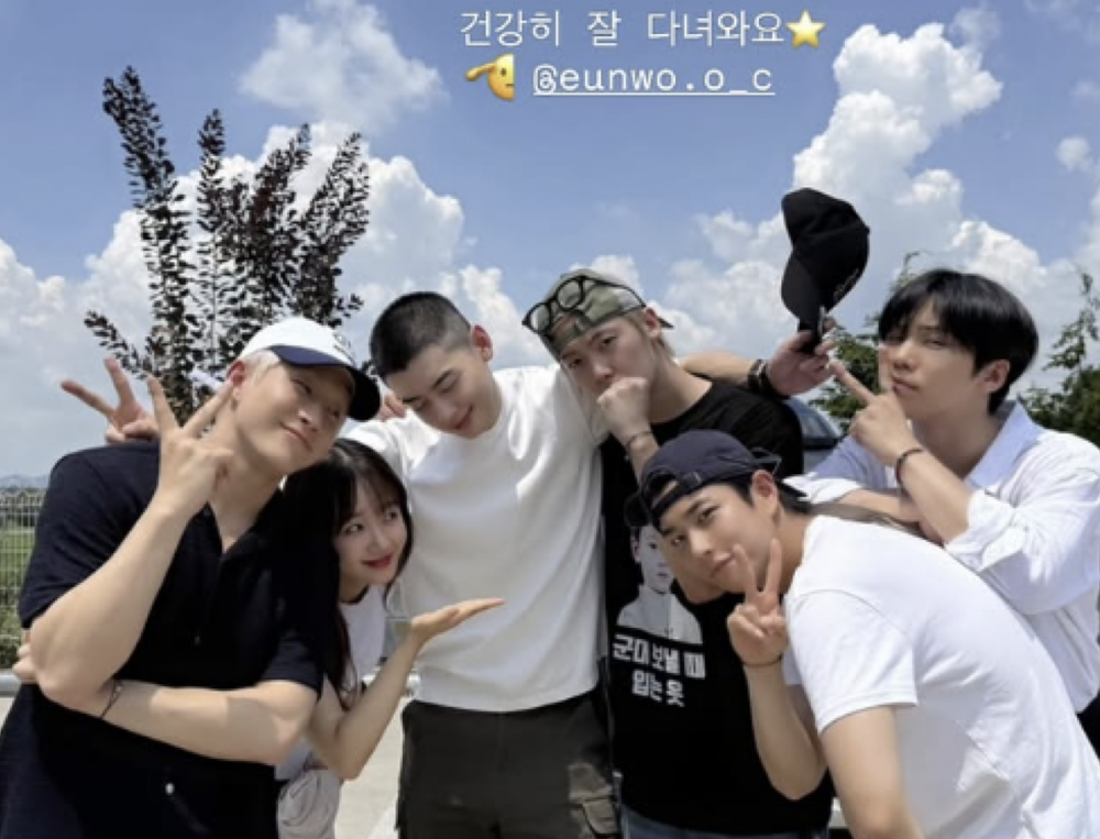On July 28, Choi Yoo Jung shared a photo on social media with the caption, “Come back healthy and safe.” The picture shows her posing adorably with Cha Eun Woo and fellow ASTRO members, capturing a heartfelt moment before Eun Woo's departure.