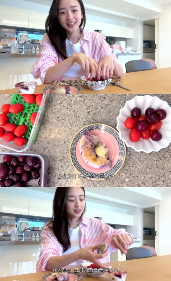 Her breakfast consisted of a few cherry tomatoes, some cherries, half a leftover bagel from the day before, and cream cheese. She shared, “I recently went on a trip to Tokyo with friends. We had dinner four times a day and ate a lot of salty food. Then a big event came up the next week, so I’m trying to get back on track quickly.”