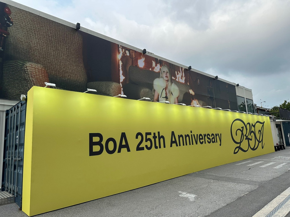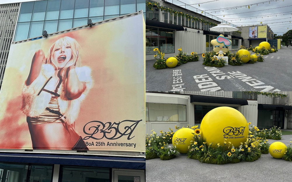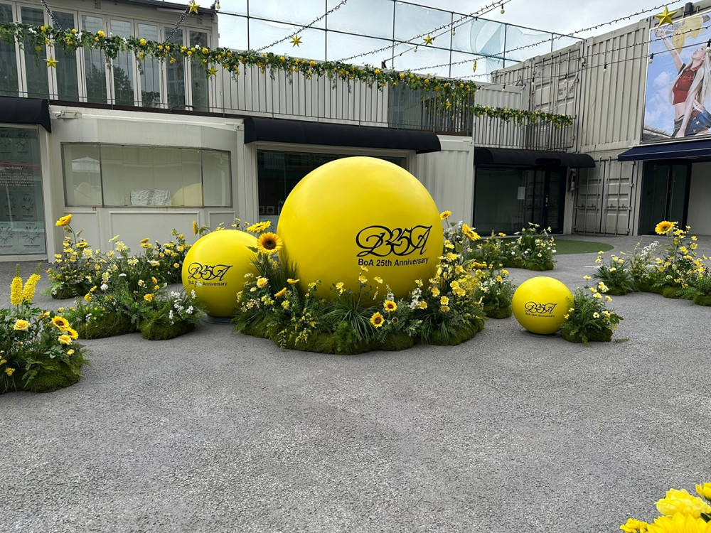 To honor the milestone, admirers decorated the area with eye-catching installations, including yellow sphere balls on the ground emblazoned with the phrase, "BoA 25th Anniversary," and a large billboard featuring the singer.