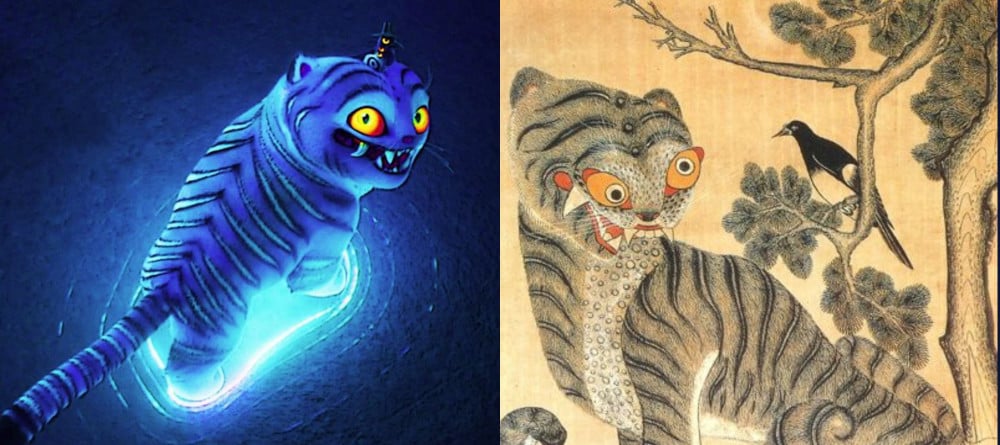 Derpy, the blue tiger, and Sussie, the six-eyed magpie wearing a tiny black gat, are the scene-stealers in the film. These characters draw inspiration from ‘jakhodo,’ a traditional Korean folk painting that pairs the tiger and magpie as symbols of protection and good fortune. In Korean culture, the magpie is seen as a messenger of good news, while the tiger is regarded as a guardian that wards off evil and protects the home.