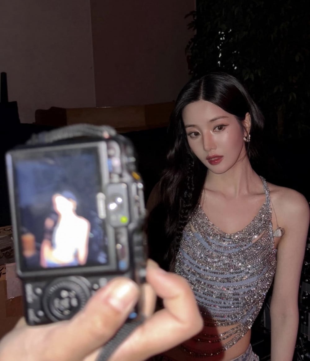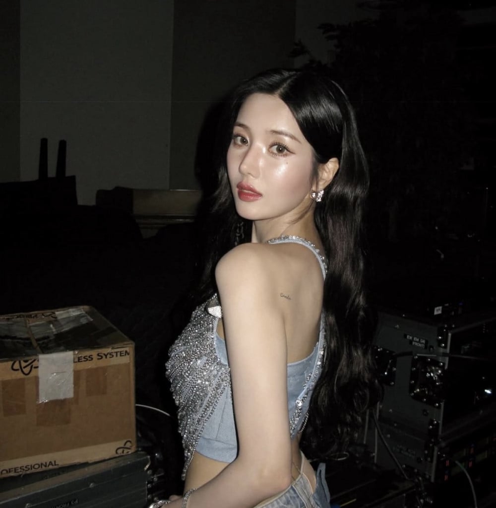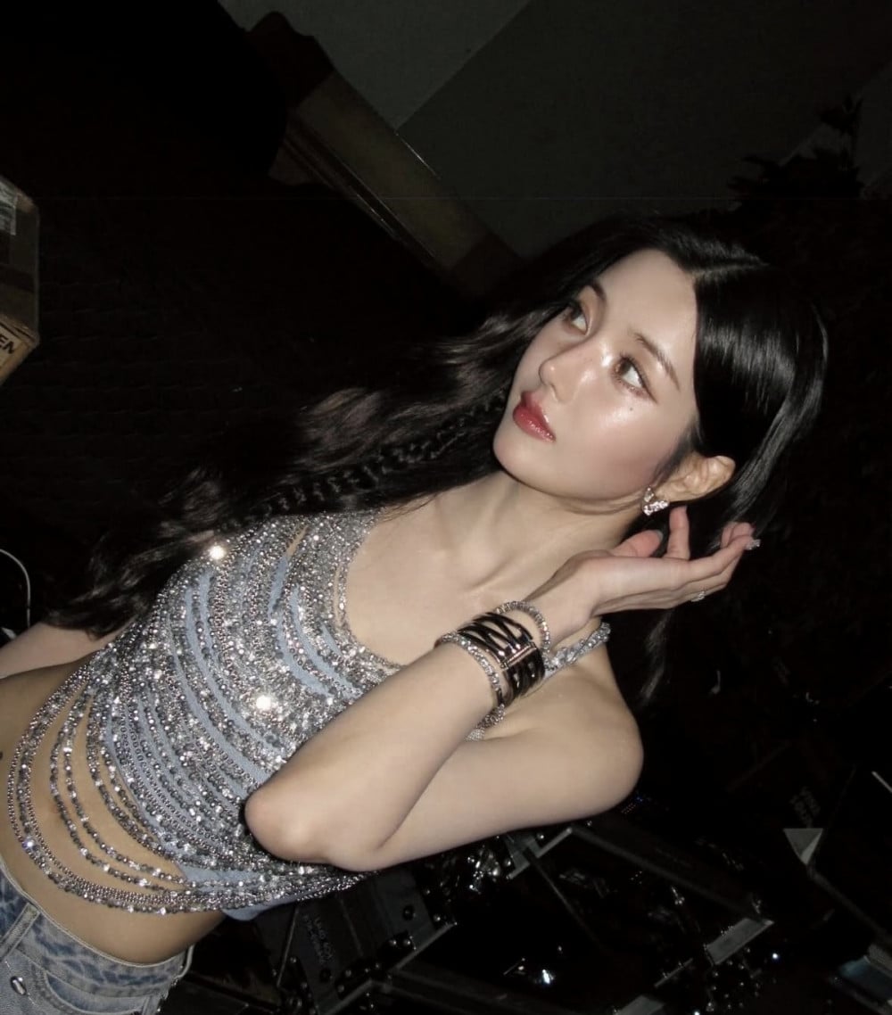 In the images, Kwon Eun Bi is seen wearing a crystal-embellished top paired with denim pants, effortlessly blending glamour and a casual edge. Her wavy hairstyle, defined waistline, and bold makeup added to the overall mature and alluring aura that lit up the stage.