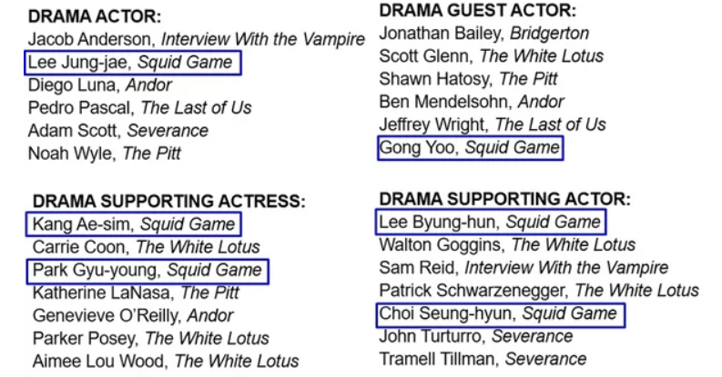According to the Gold Derby website on August 19 (KST), Netflix’s hit series 'Squid Game' earned a total of six awards, including Best Drama Series. Lead actor Lee Jung Jae, who played Seong Gi Hun, won Best Actor in a Drama, while Kang Ae Shim (Oh Il Nam’s wife Jang Geum Ja) took Best Supporting Actress, and Gong Yoo, known for his role as the “ddakji man,” won Best Guest Performer. The ensemble cast was also honored with the Best Ensemble Award.