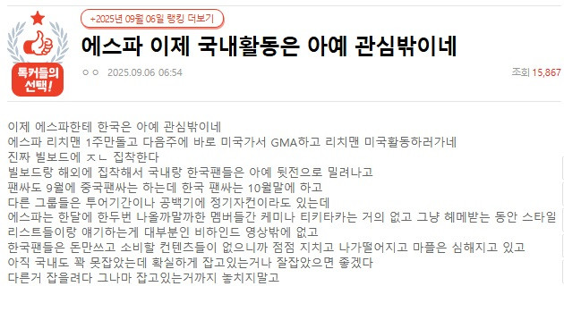 "Now it feels like Korea is completely outside of aespa’s focus. After just one week of promoting 'Rich Man' in Korea, they’re immediately heading to the U.S. for GMA and to push 'Rich Man' promotions there. They’re seriously obsessed with Billboard. Their fixation on Billboard and overseas activities is pushing domestic promotions and Korean fans completely to the side. Even with fan signings, there’s one in China in September, but the Korean fansign isn’t until late October.