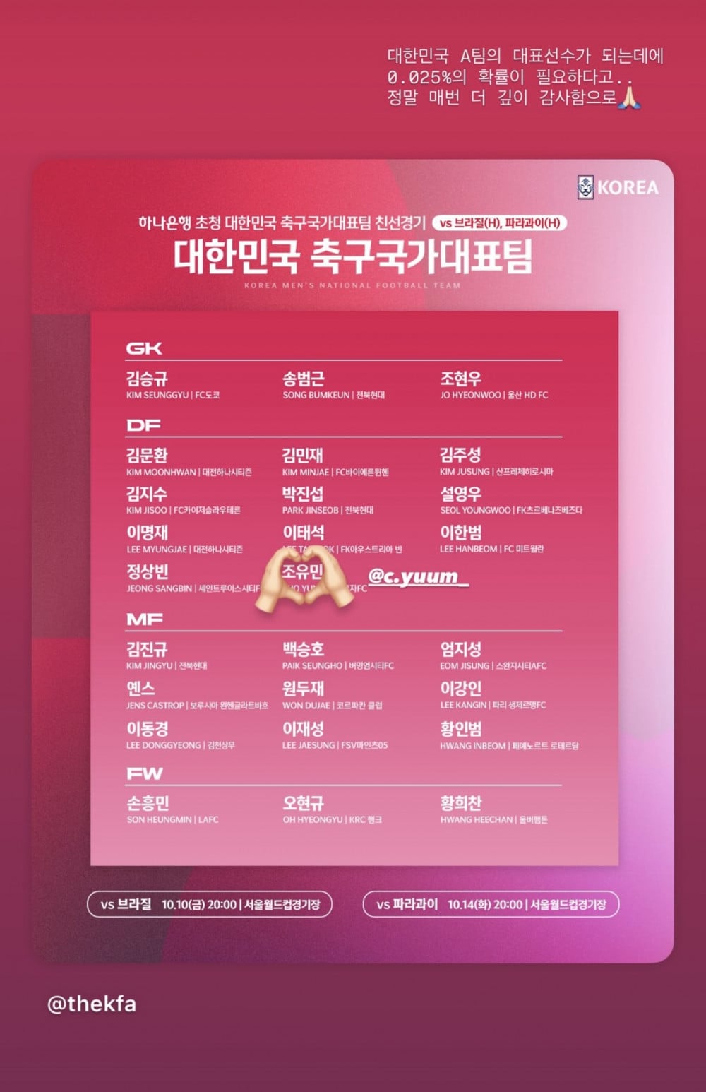The roster included top stars such as Son Heung Min, Kim Min Jae, Lee Kang In, and Hwang Hee Chan—alongside Cho Yu Min’s name.