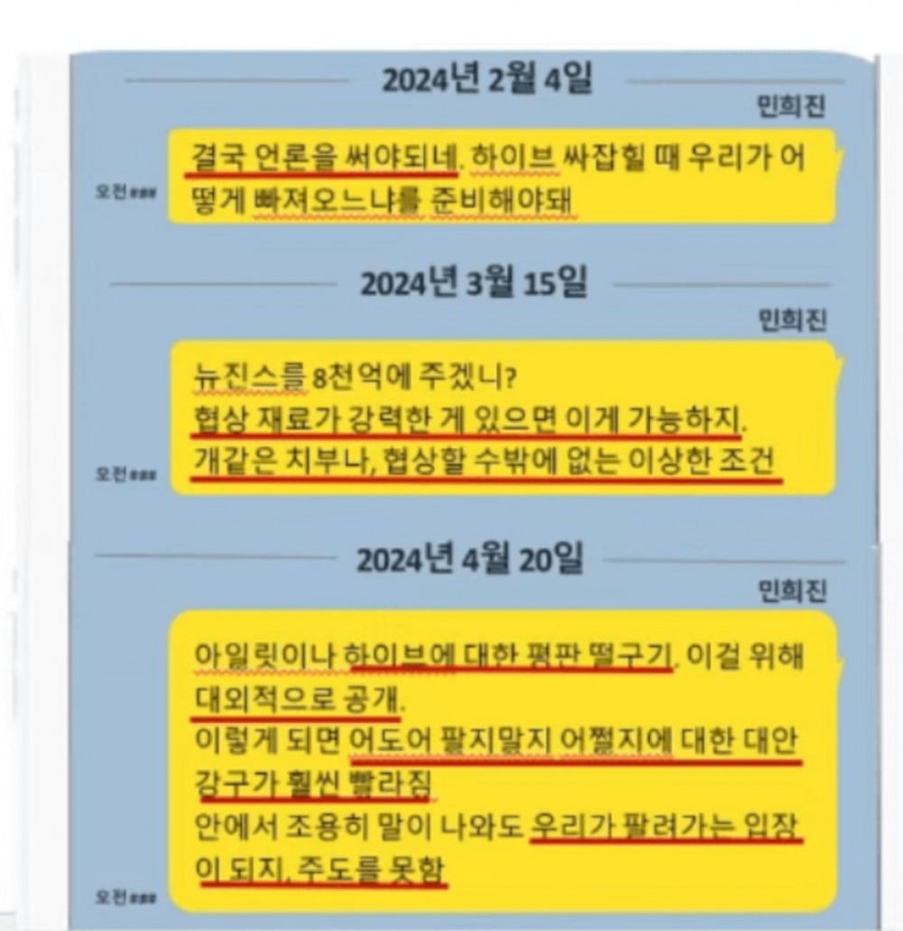On February 4, 2024, she wrote: “In the end, we will have to use the media. When we fight HYBE, we need to be prepared for how to break through.”