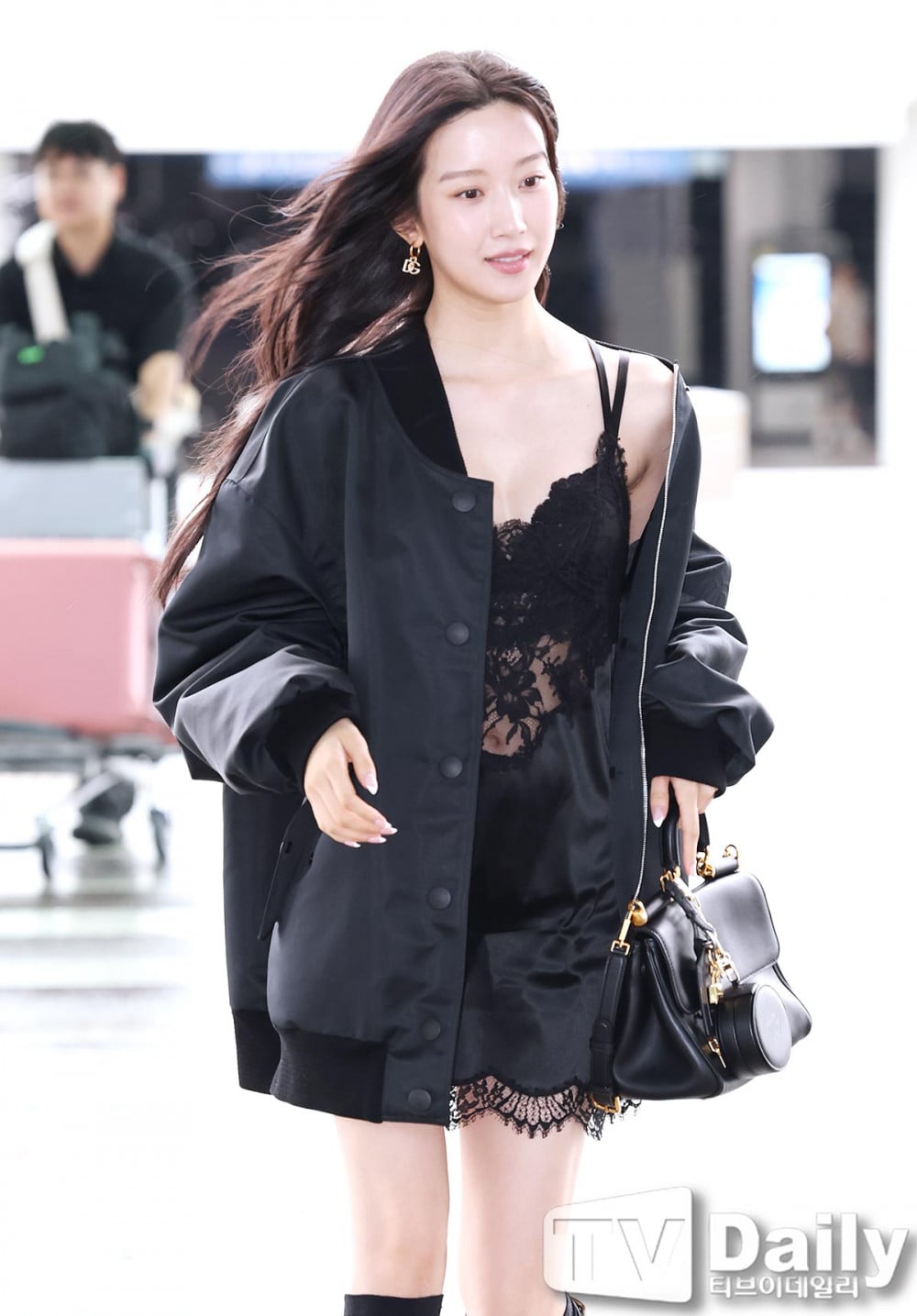 On this day, the actress appeared in front of fans and reporters donning on a black jumper over a 'Dolce & Gabbana' lace slip dress, drawing attention to her slim and petite figure.