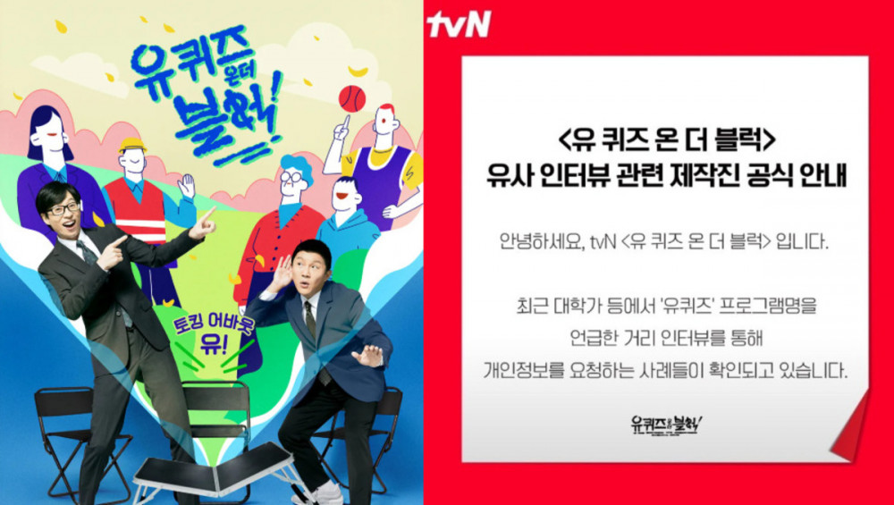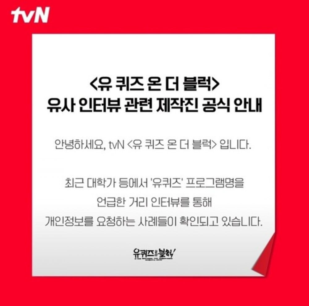 tvN’s popular variety show 'You Quiz on the Block' has issued a warning to the public after reports surfaced of individuals impersonating the show’s production team.