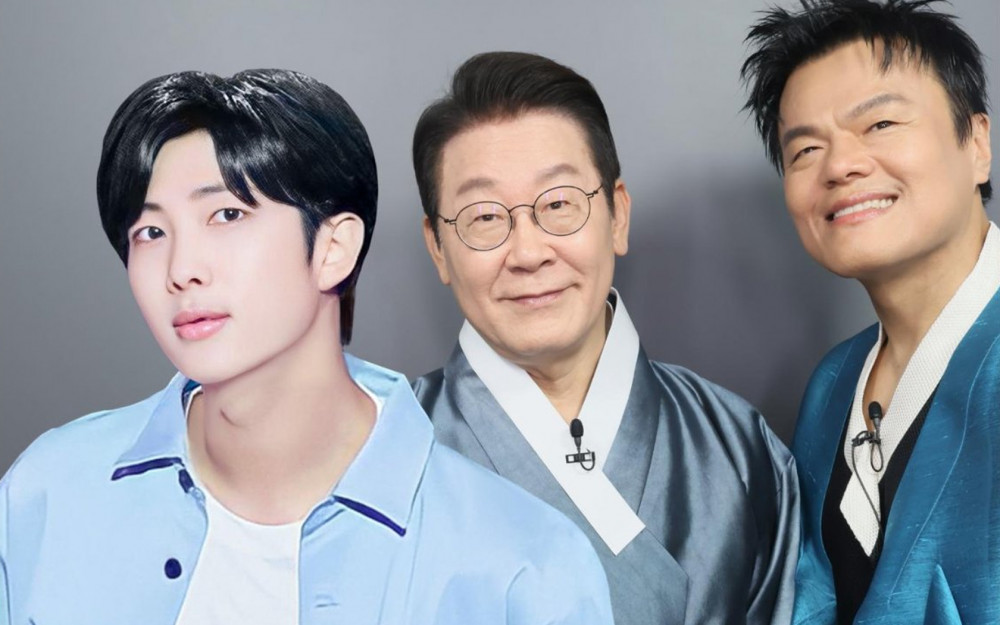 A photobooth photo collage of President Lee Jae Myung and J.Y. Park is going viral. The two were spotted posing in a photobooth using BTS RM’s signature photo frame in the popular four-cut style.