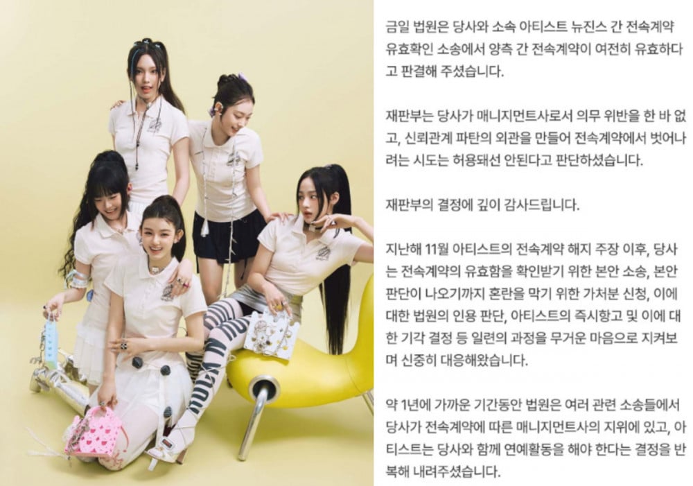 “Today, the court ruled that the exclusive contracts between our company and our artists NewJeans remain valid. The court determined that our company did not violate any obligations as a management agency and that any attempt to break away from the exclusive contracts by citing a breakdown in trust should not be permitted. We are deeply grateful for the court’s decision,” the statement read.