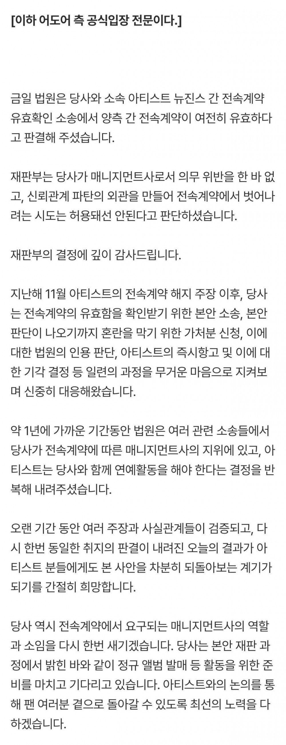In the statement, ADOR emphasized that the court found the agency did not violate any obligations as a management company, and that attempts by the artists to terminate the contracts on the grounds of a breakdown in trust were not justified.