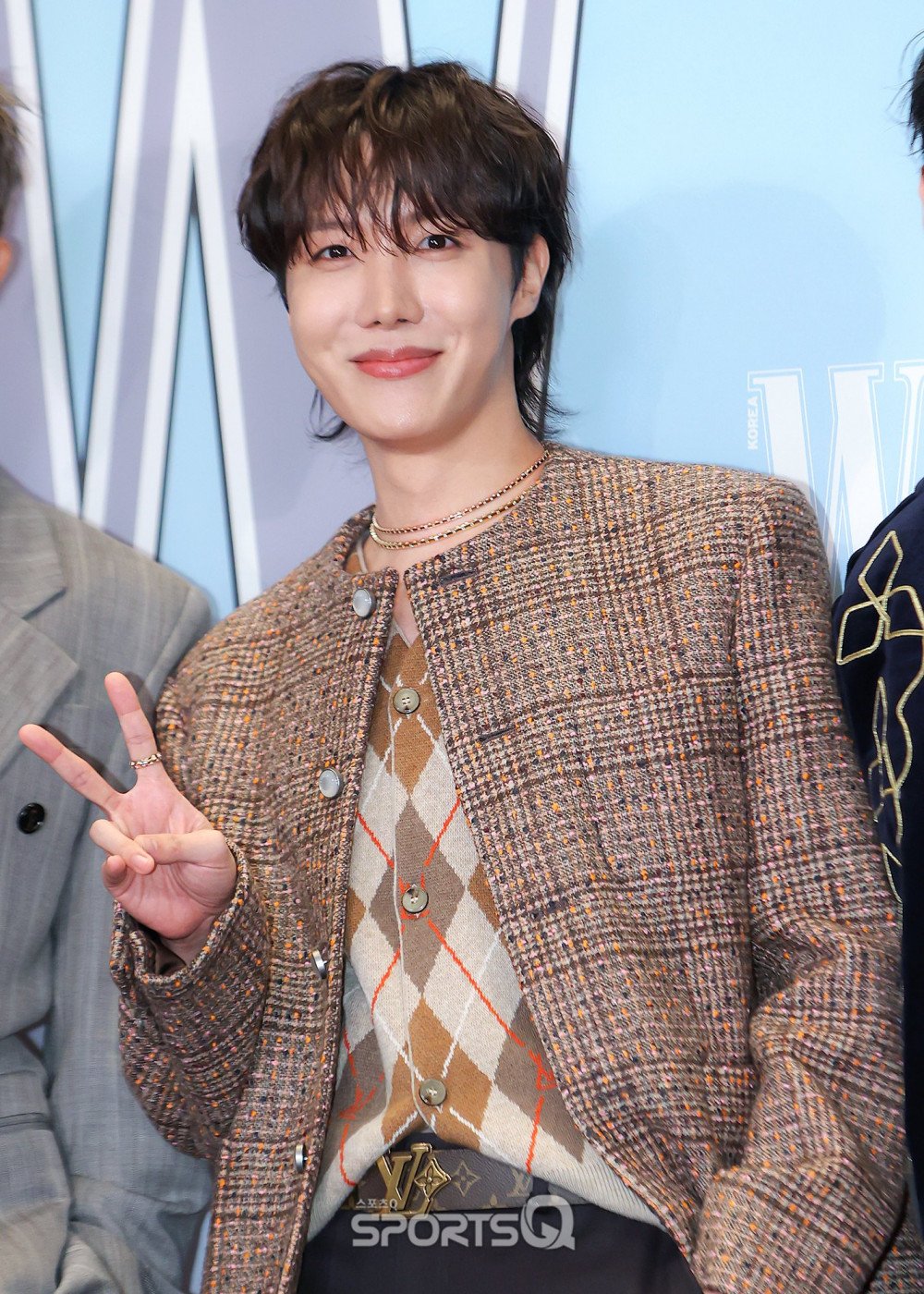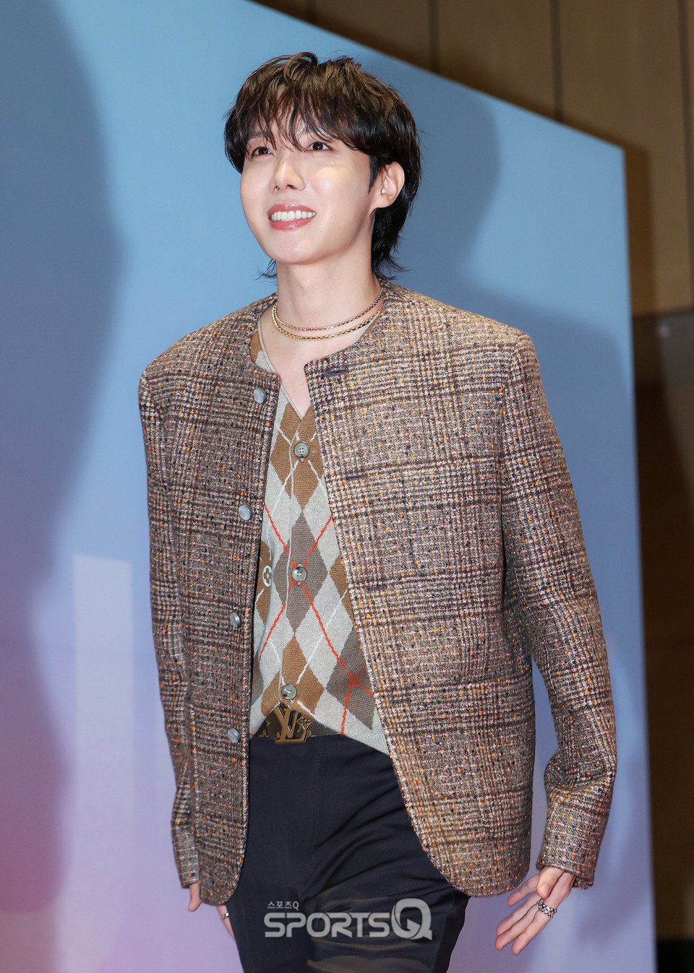J-Hope wore a brown tweed blazer over a cardigan in shades of brown, beige, and orange. He paired this with dark trousers and a dark belt with a large gold buckle.