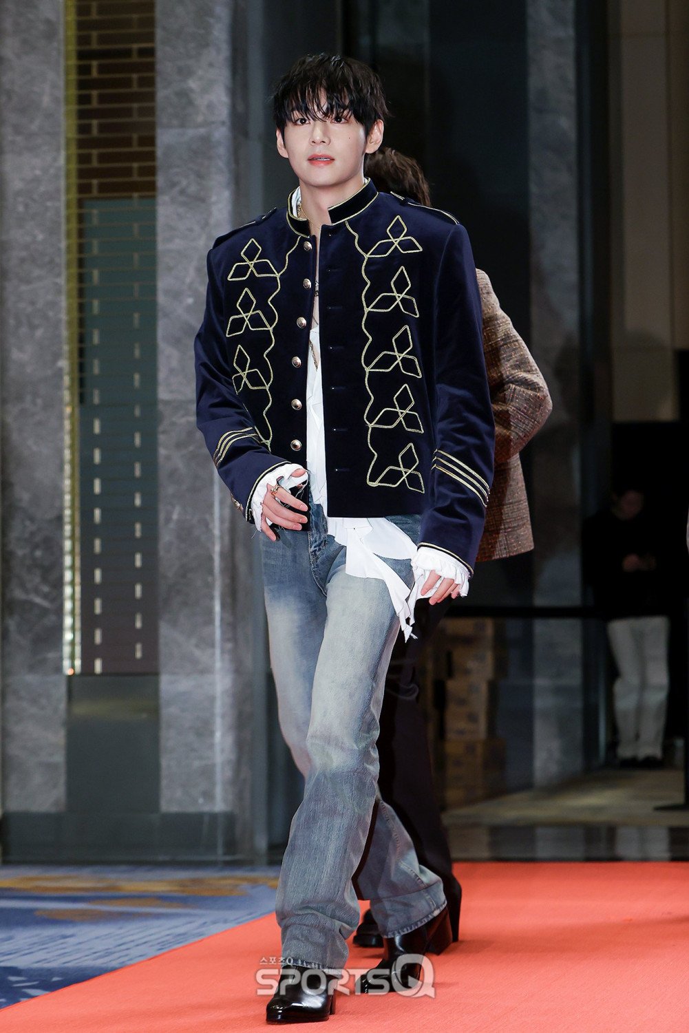 Taehyung wore a striking navy velvet military-style jacket with elaborate gold embroidered detailing. Underneath, he has on a white ruffled shirt left partially unbuttoned, accessorized with several layered Cartier necklaces, and the outfit is completed with denim jeans.