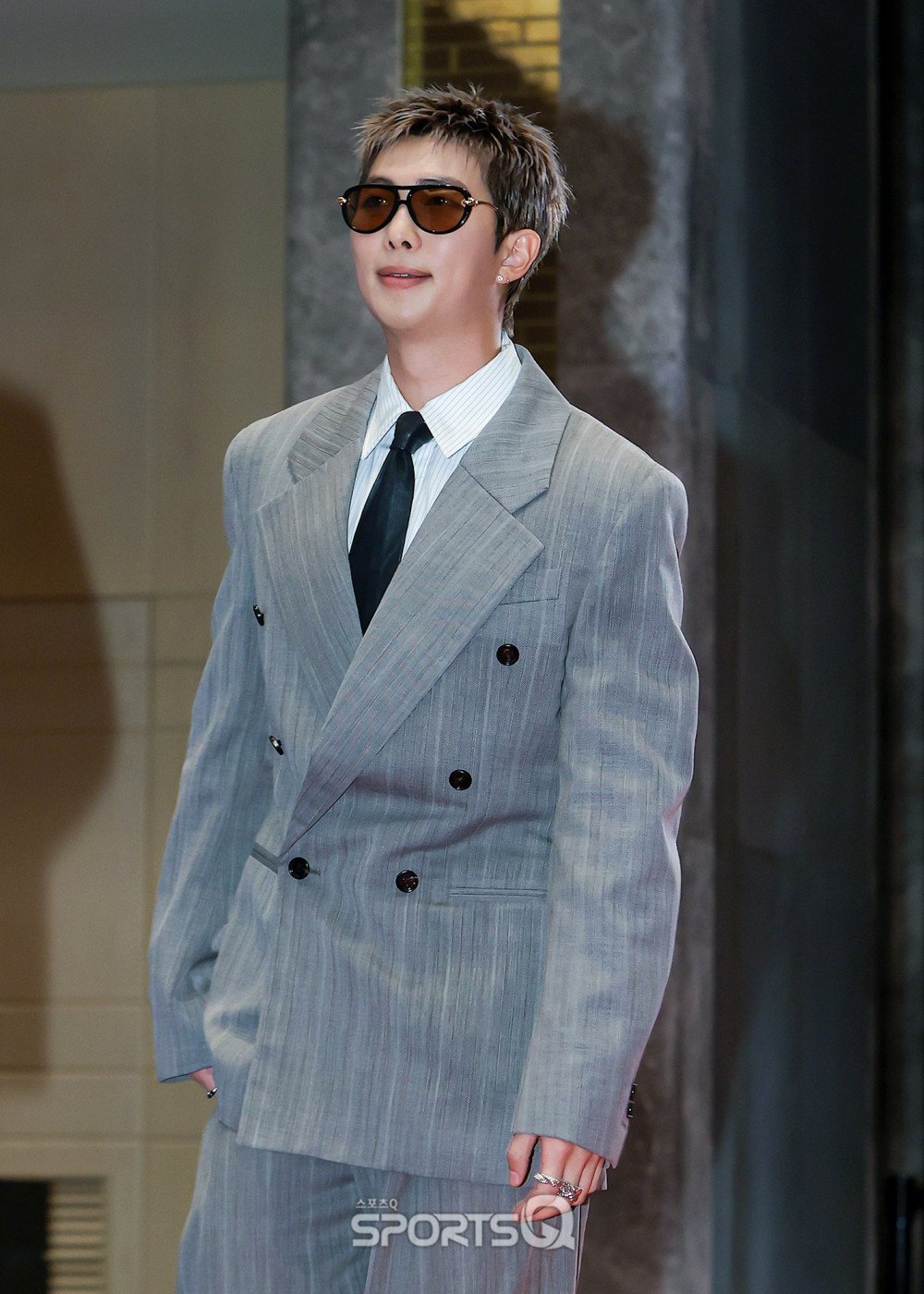 RM wore a stylish grey double-breasted suit with wide lapels and black buttons. He pairs the suit with a light-colored striped dress shirt and a solid black necktie, completing the look with dark-lensed sunglasses.