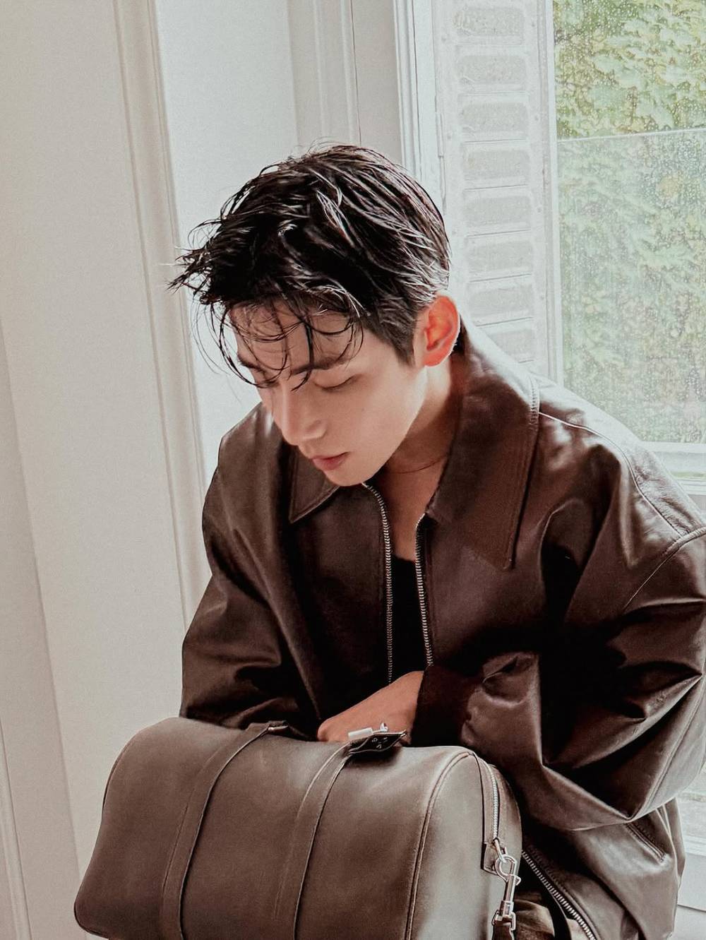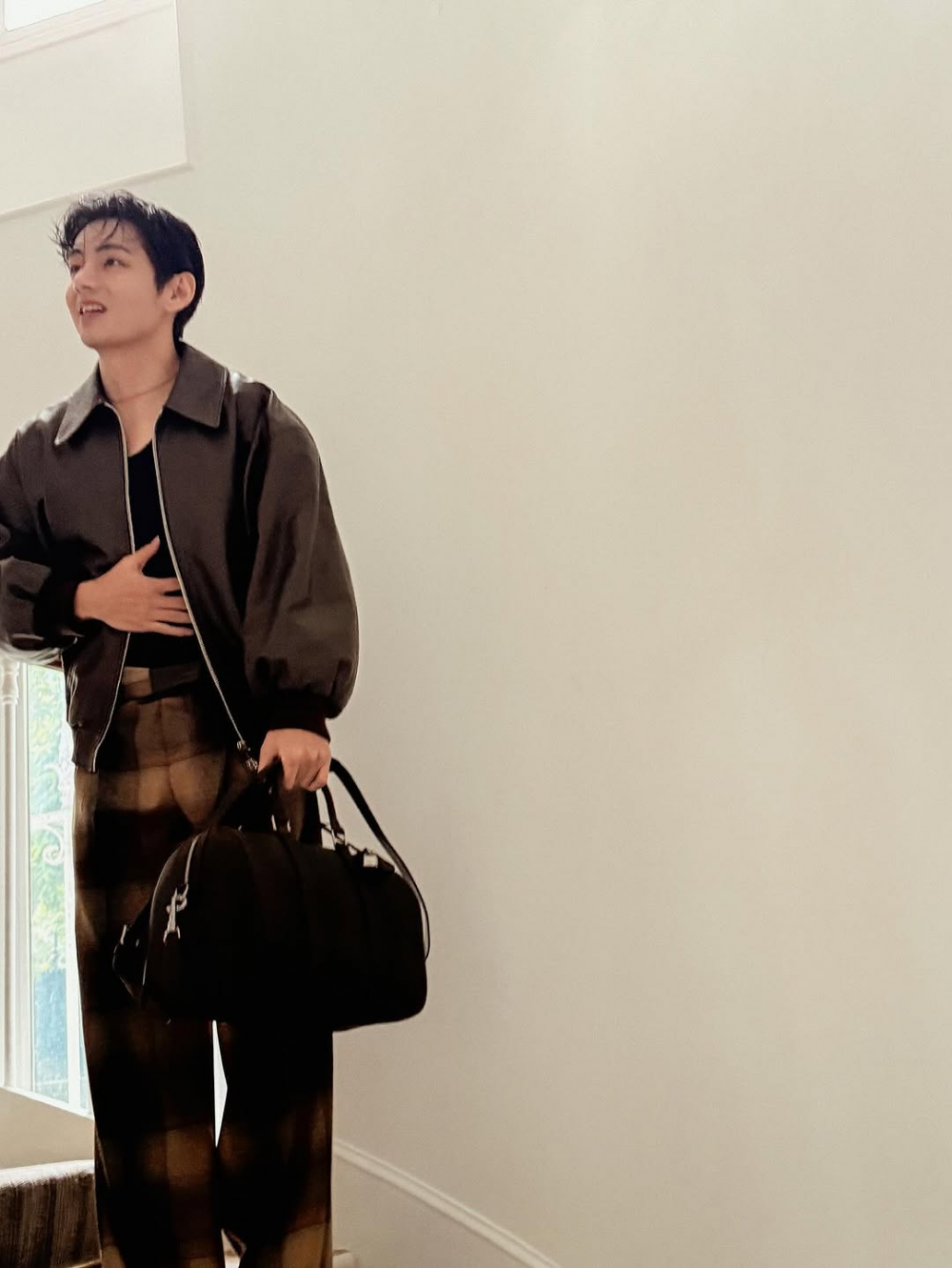 In this shoot, V, as Celine's global ambassador, chose the brand's signature brown leather jacket as the centerpiece of his outfit. Layered under the oversized jacket was black innerwear, creating a modern yet casual vibe.