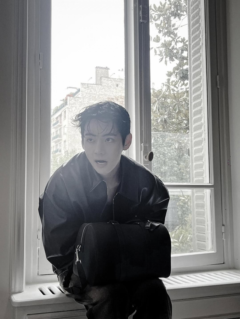 V maximized his natural charm with slightly wet hair and restrained makeup. One particular shot, where he holds a yellow autumn leaf while posing next to a tree, perfectly blends the essence of fall with urban sophistication.