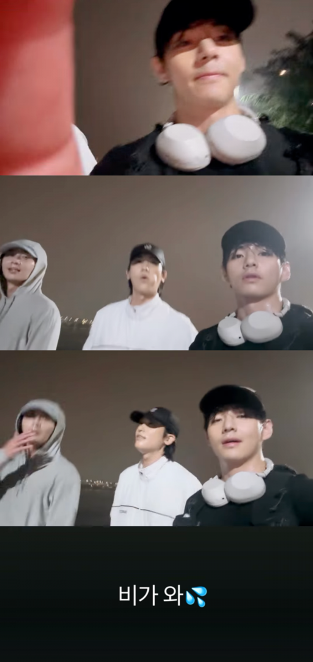 On October 12, V shared a short video on his social media with the simple caption, "It's raining." In the clip, the three stars are seen enjoying a casual stroll along the Han River, walking mask-free in the rain with only hats and no umbrellas.