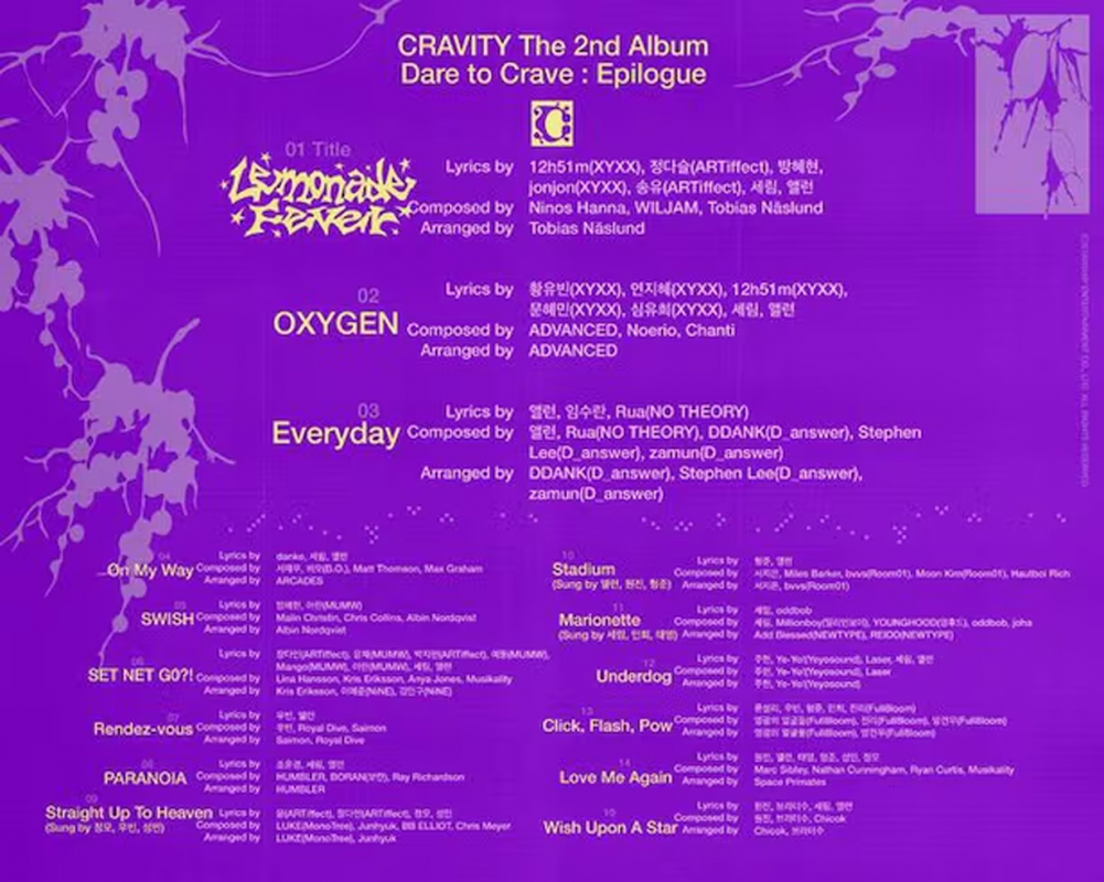 According to the revealed tracklist, the upcoming album consists of a total of 15 tracks—combining the 12 songs from their June release, 'Dare to Crave,' with three new additions. The new songs include the title track “Lemonade Fever,” along with “OXYGEN” and “Everyday.” These are followed by previously released tracks such as “On My Way,” “SWISH,” “SET NET G0?!,” “Rendez-vous,” “PARANOIA,” “Straight Up To Heaven,” “Stadium,” “Marionette,” “Underdog,” “Click, Flash, Pow,” “Love Me Again,” and “Wish Upon A Star.” Rather than simply adding new songs, the album forms a cohesive narrative unique to CRAVITY—one that flows through emotions and sensations born from desire.
