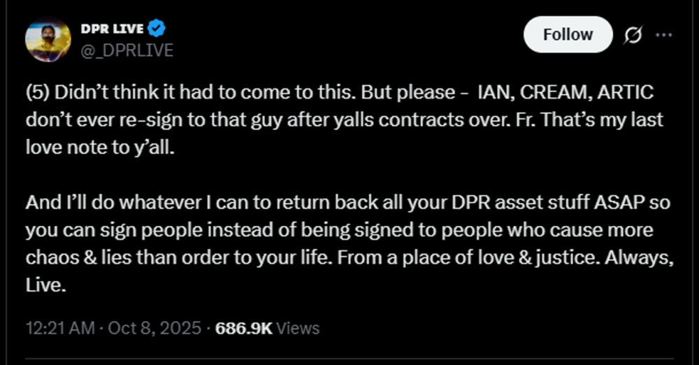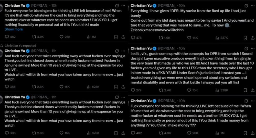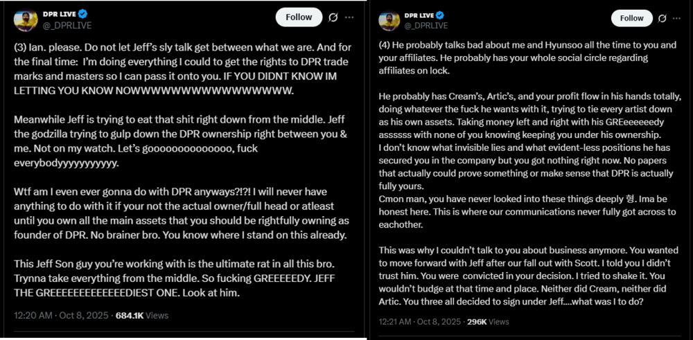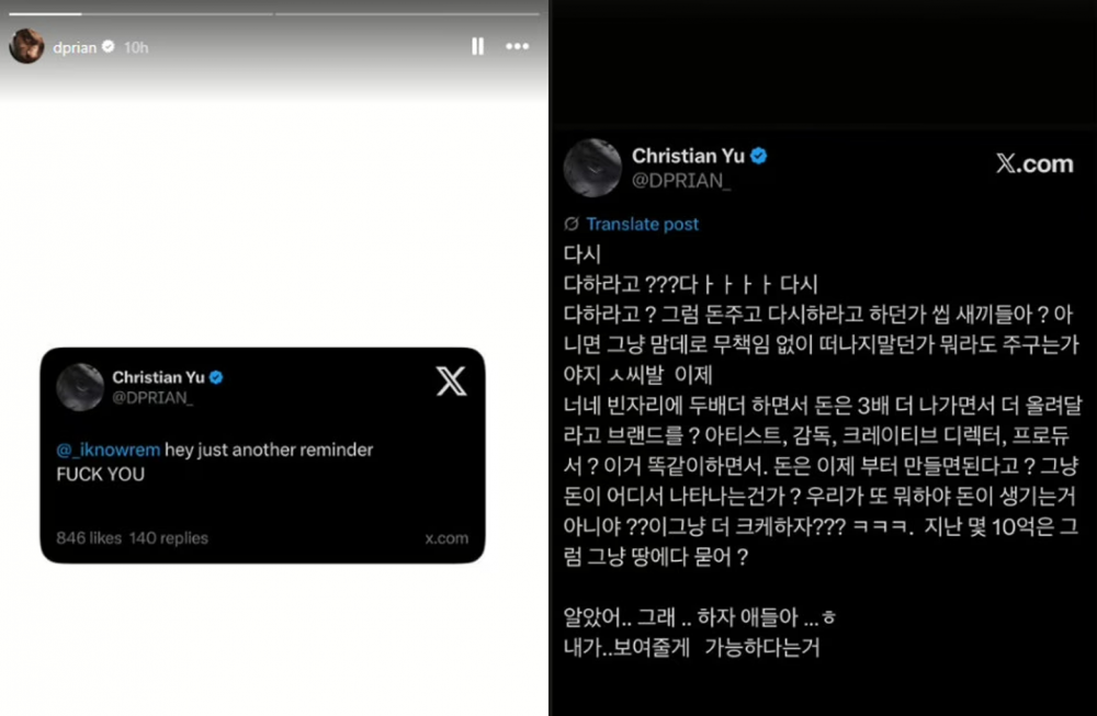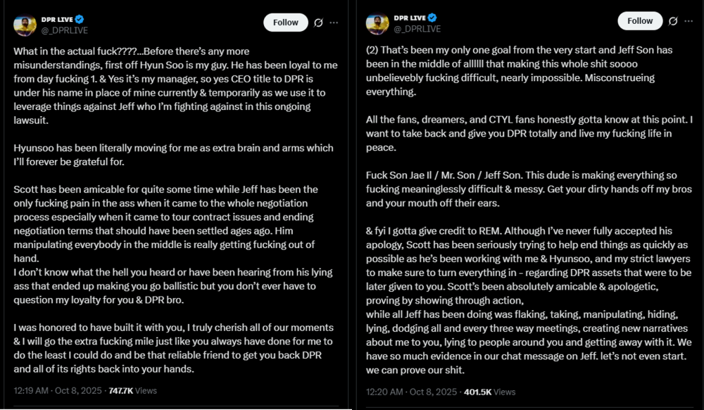 On October 7, DPR Ian wrote on his X (formerly Twitter) account, calling out Scott Kim (DPR REM), a former core member and business manager of DPR, of financial exploitation. Ian wrote, "Again? Do it again??? Aaaaagain Do it again? Then tell them to do it again by paying money, you f****g b*****ds? Or just don't leave irresponsibly without any responsibility, at least try to do something, f***. Now," He continued, "You're leaving your spot empty, doing twice as much while spending three times the money, and asking to raise the brand more? Artist, director, creative director, producer? Doing the exact same thing. From now on, can you just make money? Where does the money just come from? What are we supposed to do for the money to appear?? Just make it bigger??? Lol. The past few billion, are you just burying that in the ground?"