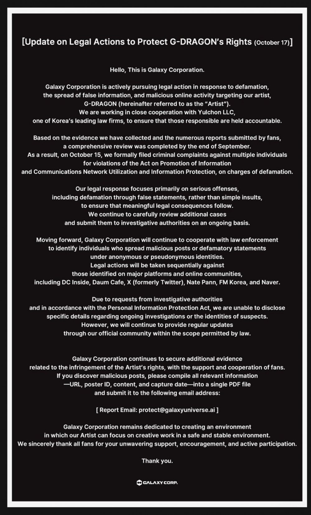 On October 17 KST, G-Dragon's management label Galaxy Corporation issued an update on its legal action against defamatory and malicious online activity targeting the musician.