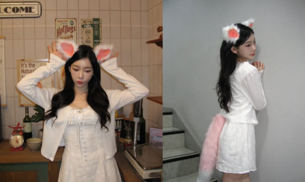 The full outfit Taeyeon showcased featured a sleeveless dress with a corset-like fitted line, layered with a cotton cardigan that added a touch of innocence and elegance. Complementing the fox ears, a matching fox tail completed the ensemble, highlighting her cute and pure charm all at once.