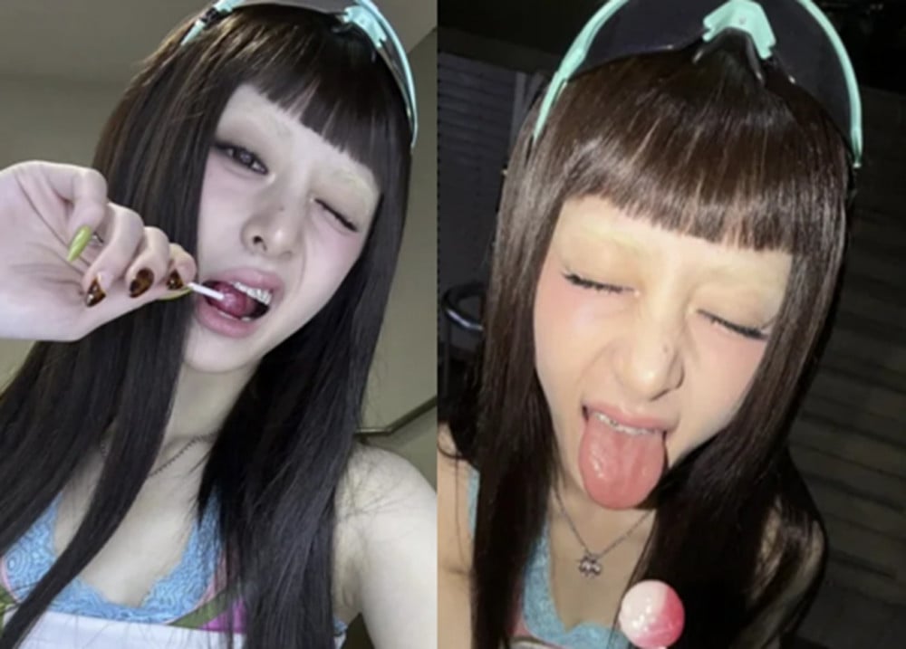In the photos, she appears with bleached eyebrows and a unique pair of goggles, exuding a quirky, rebellious charm. Holding a lollipop in her mouth and making playful expressions, Yunjin accentuates her signature offbeat vibe.