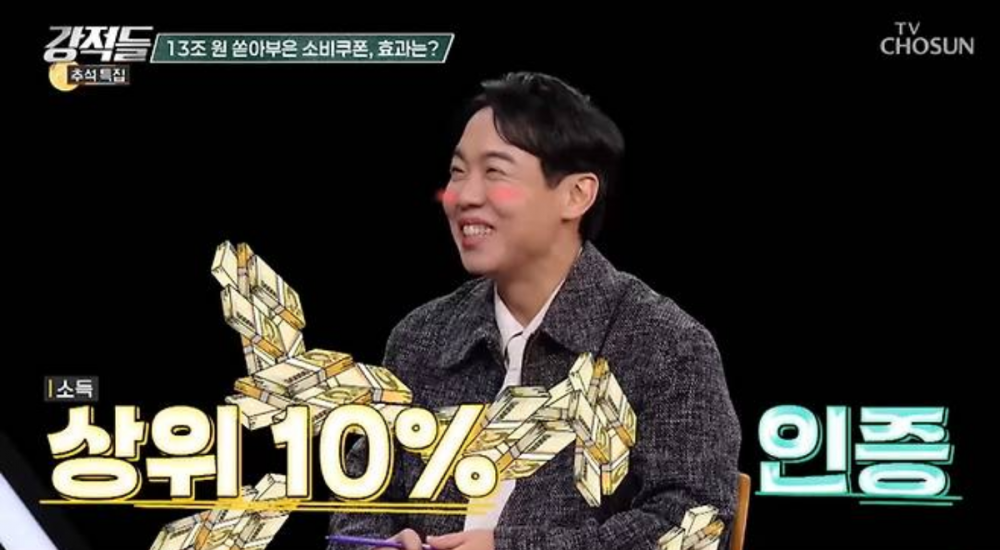 Asked whether he had received the second coupon, Hwang Hyun Hee replied, “They didn’t give me the second one,” drawing laughs from the panel. The program explained that the government began a second distribution on September 22, providing about USD 73 (KRW 100,000) per person to ninety percent of the public, excluding the top ten percent by income. He added that for the first round, he combined his coupon with his wife’s to purchase a gym membership, and observed that while such programs can boost spending briefly, “the amount isn’t that large, so after one or two bigger purchases, people tend to return to their usual habits.”