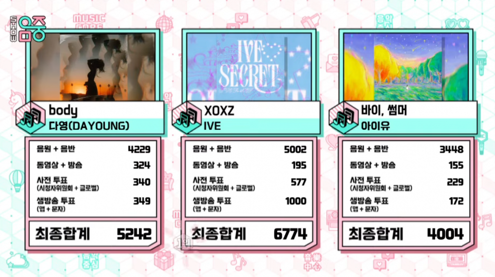 On October 18th, MBC’s 'Show! Music Core' aired a thrilling lineup, with IVE, Dayoung, and IU competing for the top spot. IVE’s latest hit, “XOXZ”, Dayoung’s “Body”, and IU’s “Bye, Summer” were the nominees for 1st place