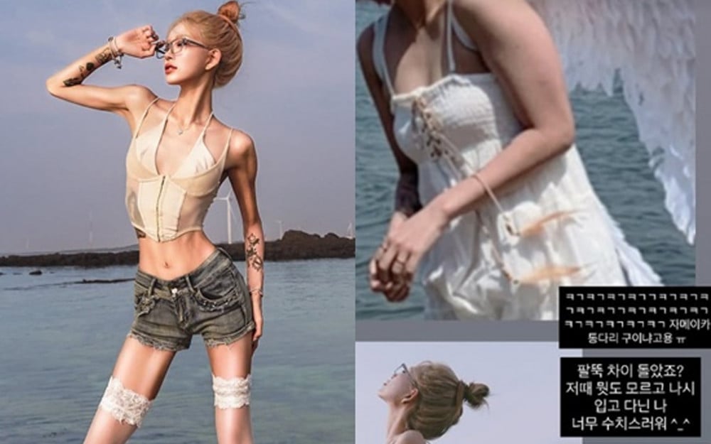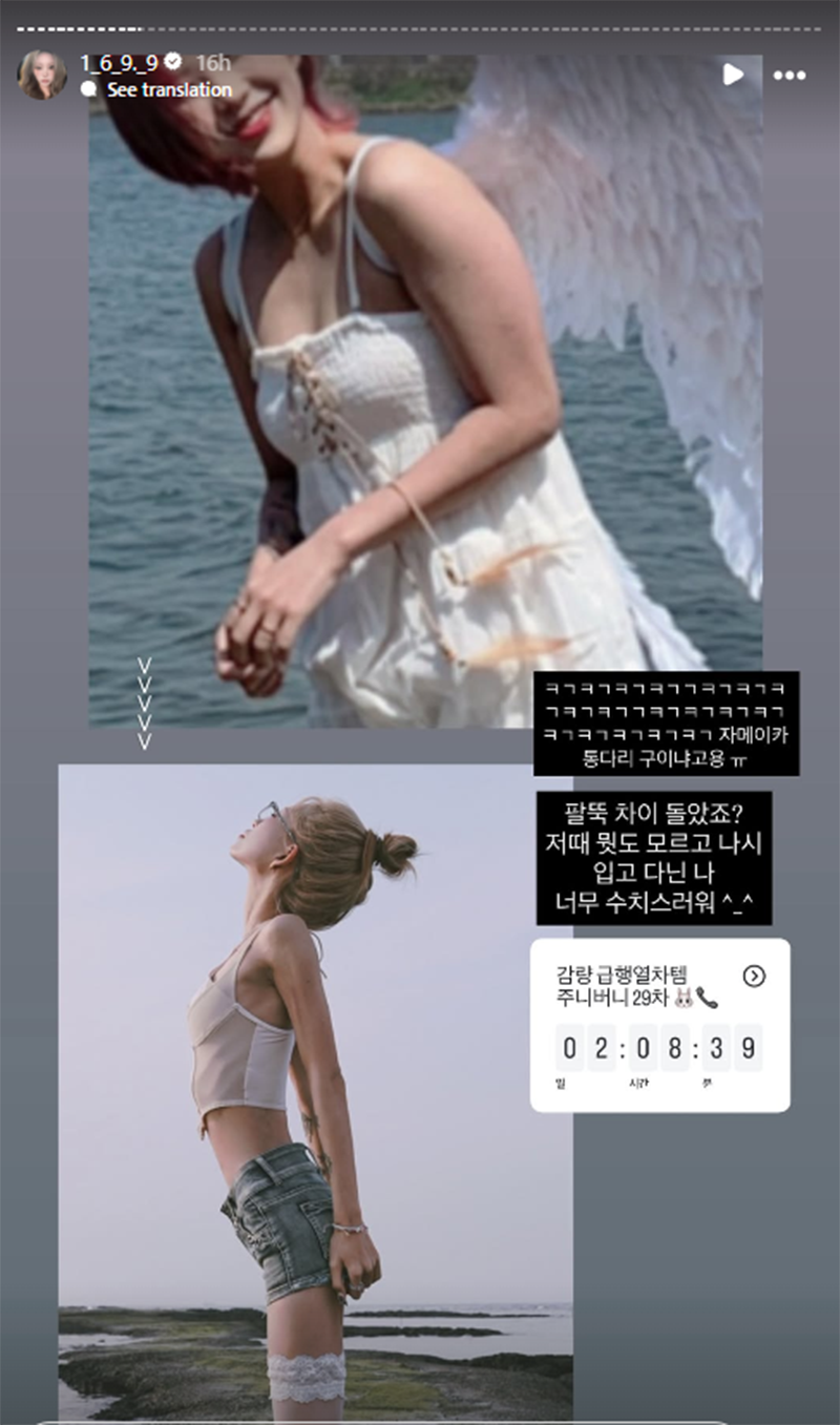 In the photos, Choi Jun Hee flaunted noticeably slimmer arms and shoulders than before, captioning, “Are these Jamaican grilled chicken legs? The difference in my arms is crazy, right? I was so clueless back then, walking around in a sleeveless top. It’s so embarrassing now.”