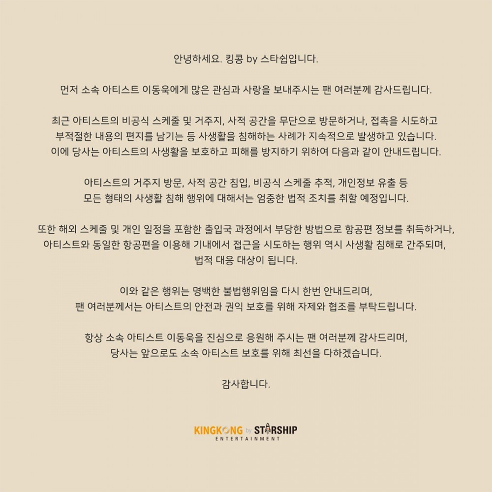 On October 14, his agency KINGKONG by Starship Entertainment released an official statement addressing the matter, saying, “Recently, there have been cases of individuals visiting Lee Dong Wook’s residence and private spaces without permission, attempting to make contact, or leaving inappropriate letters. These actions constitute clear violations of his privacy.”