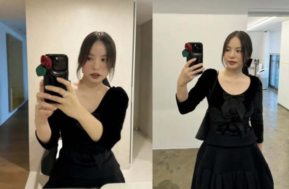 The photos showed the star taking a mirror selfie while wearing an elegant black two-piece outfit, the same outfit she recently wore to a wedding that drew attention online. On October 10, Min Hyo Rin attended photographer Mok Jung Wook’s wedding with her husband Taeyang of Big Bang. Photos from the event circulated through online communities, sparking discussion about her appearance.