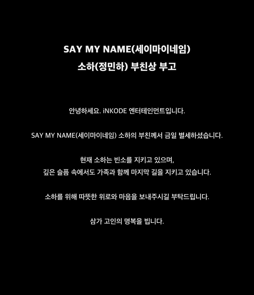 On October 10 KST, iNKODE released an official statement to deliver the unfortunate news of the passing of SAY MY NAME member Soha's father.