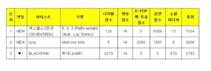 CxM secured the top spot on the 'Music Bank' K-Chart with a total of 7,014 points for the tracking period of September 29 to October 5. Following closely were izna’s “Mamma Mia” in second place with 3,608 points, and BLACKPINK’s “JUMP” in third place with 2,763 points.