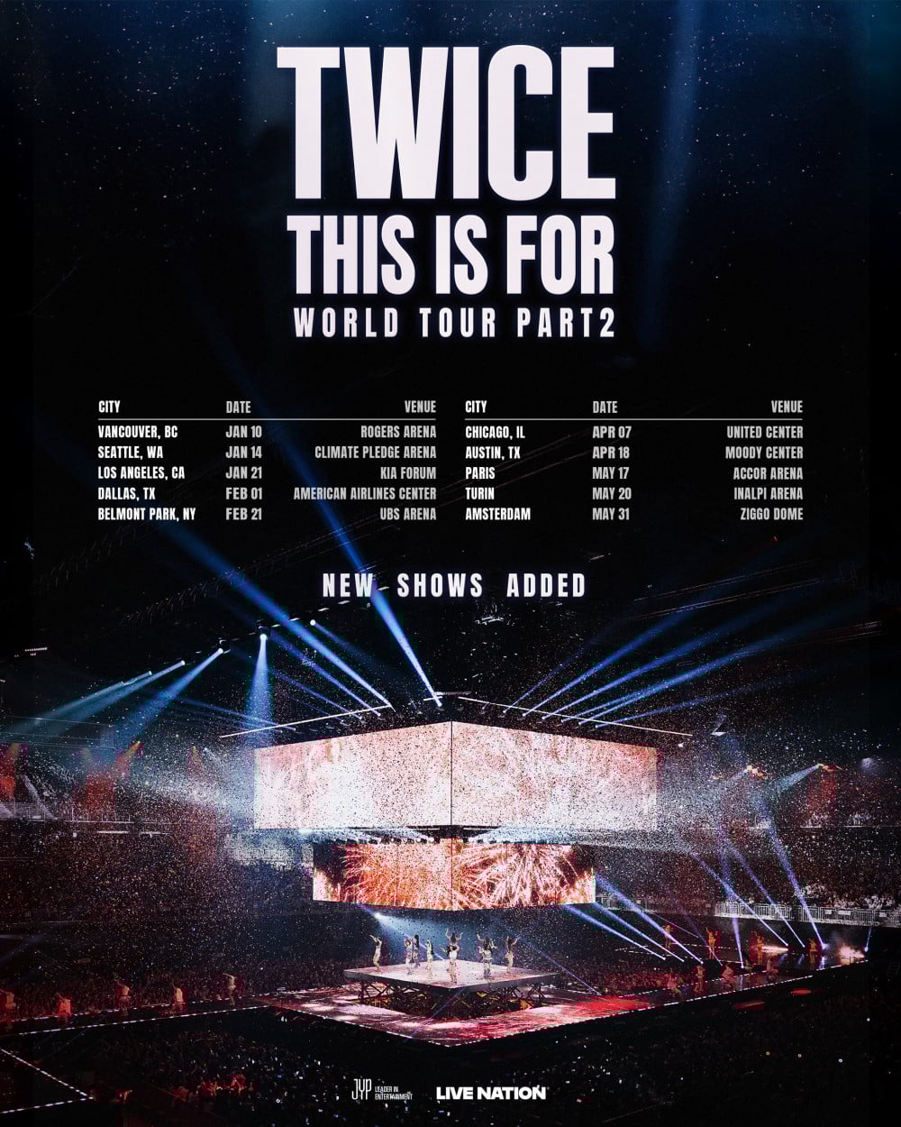 Following last week's ticket sales, TWICE added second shows in Oakland, Washington, D.C, Hamilton, Orlando, Boston, and London, as well as a third show in Los Angeles. Additional shows now include second performances in Vancouver, Seattle, Dallas, Chicago, Austin, Paris, and Amsterdam, while Belmont Park, NY, will host a third show. A new date has also been announced in Turin, Italy. This expansion brings the total number of newly added shows to 17, including the first-ever K-pop arena shows in Detroit, St. Paul, Denver, Boston, and Montreal.