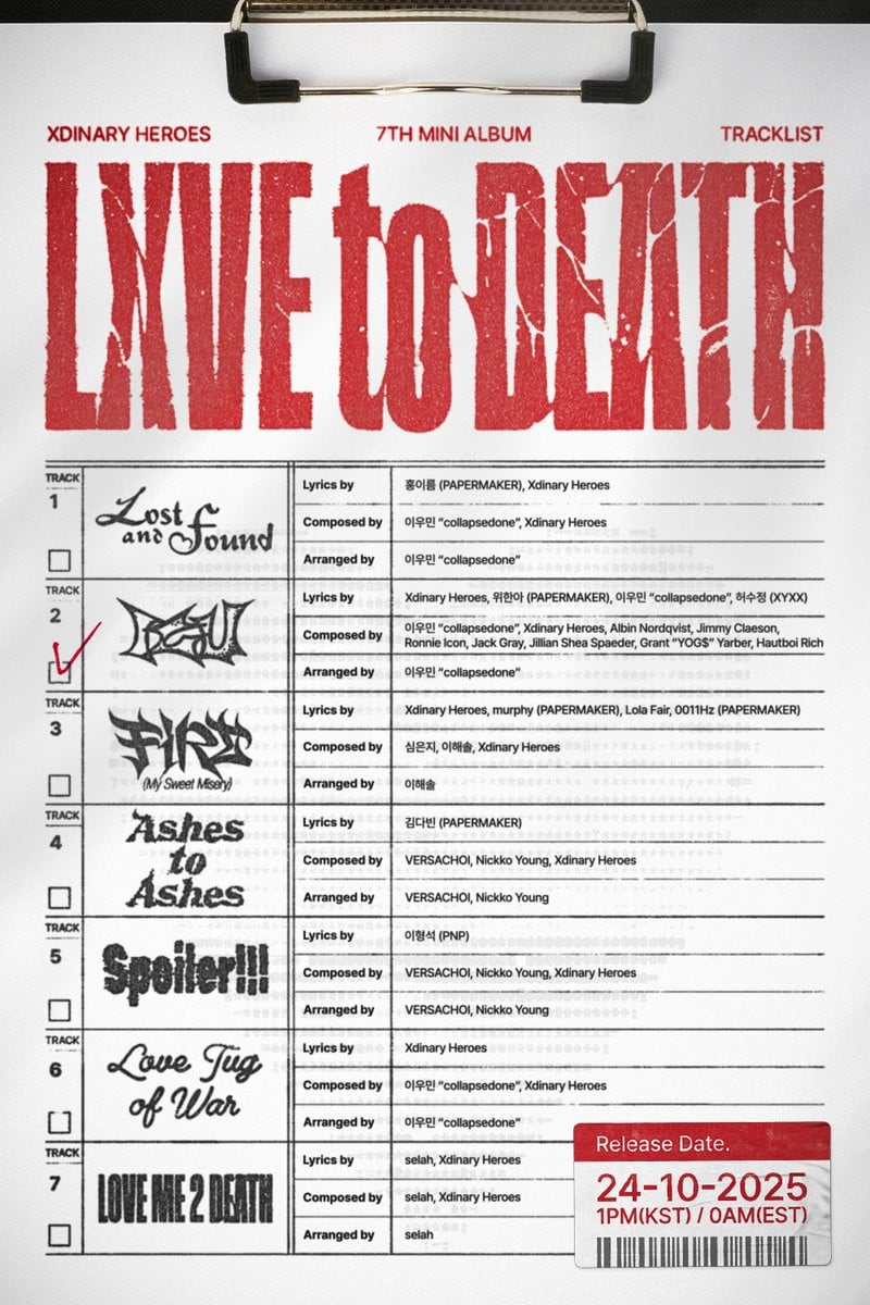Set for release on October 24 at 12 AM EST / 1 PM KST, the JYP Entertainment band's new album features a total of 7 tracks, including the title track "ICU" and the b-sides "Lost and Found", "Ashes to Ashes", "Spoiler!!!", "Love Tug of War", "LOVE ME 2 DEATH", and "FiRE". As usual, Xdinary Heroes participated in composing or writing the lyrics to all 7 tracks.