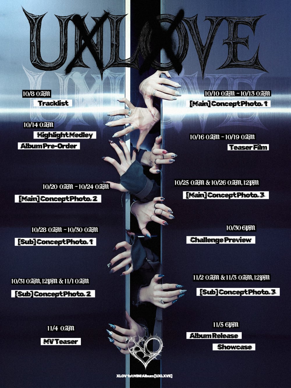 On October 7 KST, the group released the promotion scheduler for their new album ‘UXLXVE.’ According to the poster, XLOV is set to drop the track list next, followed by the highlight medley, concept photos, and music video teaser and film, leading up to the release of the album.