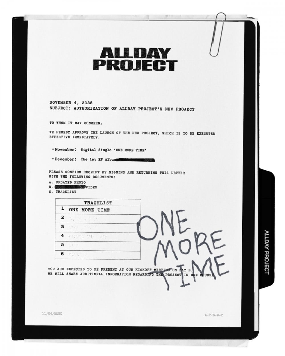 The teaser image released shows a single document enclosed in a file folder, instantly catching fans’ attention. The sheet is labeled “ALLDAY PROJECT’s New Project” and includes a detailed schedule — a pre-release single in November followed by the group’s first EP in December.