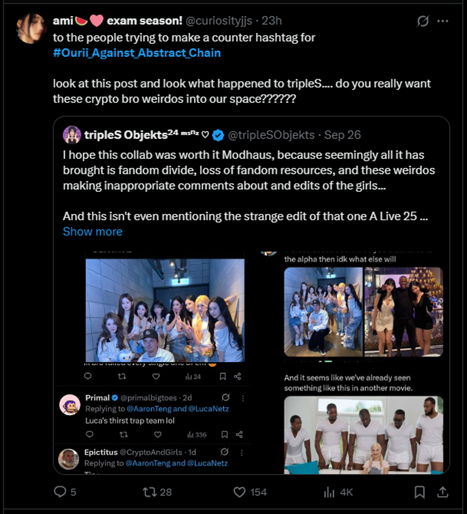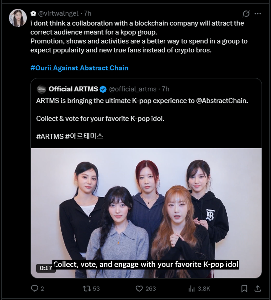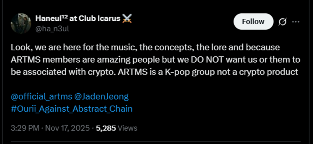Fans, known as Ouriis, quickly voiced strong opposition on social media X under the hashtag #Ourii_Against_Abstract_Chain. Fans argue that the crypto-based initiative conflicts with ARTMS’s core focus on music, artistic concepts, and fan engagement. Many posts emphasize that promotions, live shows, and fan interactions should take priority over blockchain ventures.