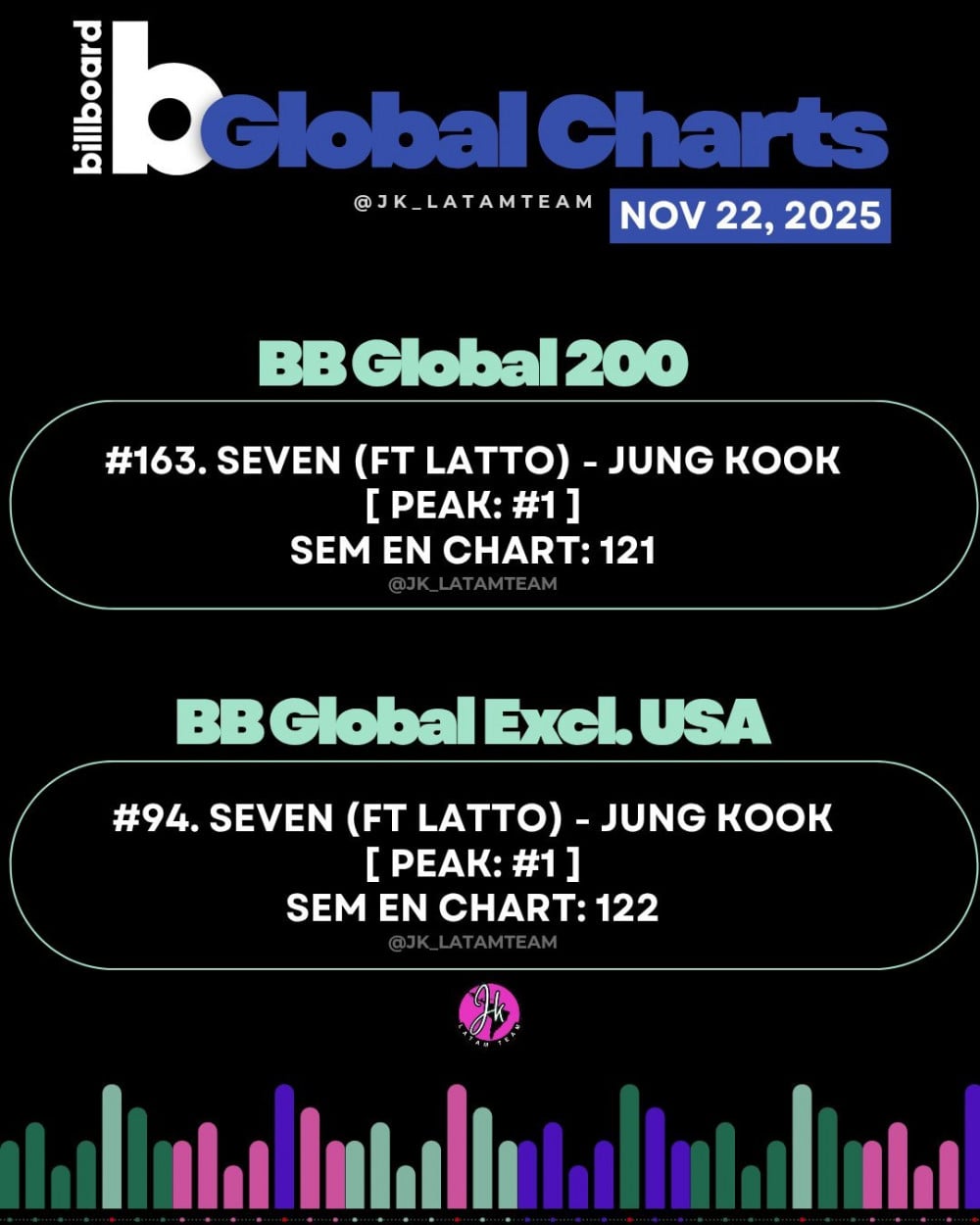 According to the Billboard charts dated November 22, Jungkook’s solo debut track “Seven” ranked No. 163 on the Global 200. Since its release in 2023, the song has maintained steady popularity, spending 121 weeks on the chart, marking the first and longest-running record for an Asian solo artist.