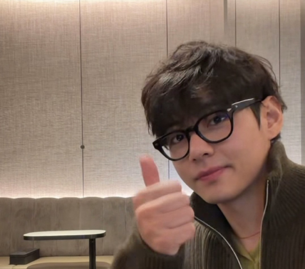 Wearing brown knitwear and horn-rimmed glasses, V showed off his sculpted visuals and waved to fans, adding to the warmth of the moment.